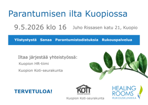 Kuopion Healing Roomsin rukousklinikka järjestää Parantumisen illan toukokuussa. Tervetuloa!