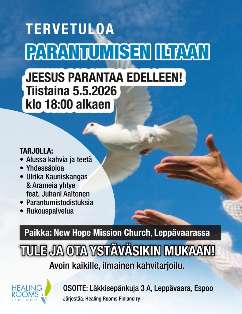 Healing Rooms järjestää Parantumisen illan tiistaina 5.5. klo 18 Leppävaarassa, New Hopen tiloissa.