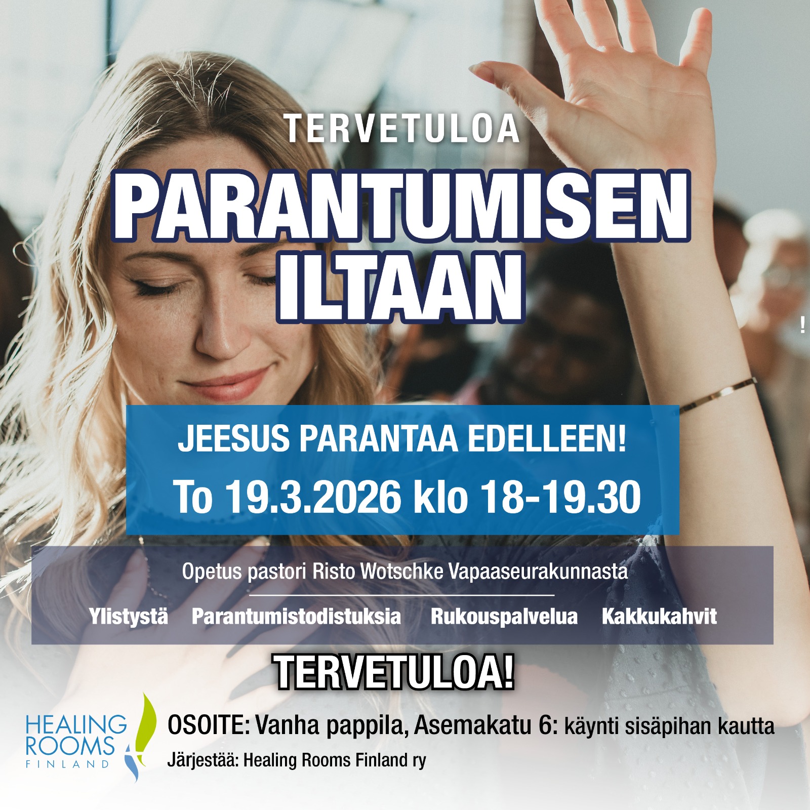 Illoista torstai 19.3.2026 klo 18–19.30 on Parantumisen ilta. Illassa juhlistetaan Suomen rukousklinikkatyön 20-vuotista taivalta kakkukahvien ja yhteisen ylistyksen merkeissä. Tämän jälkeen on Raamattuun perustuvaa opetusta parantumisesta. Opetuksesta vastaa pastori Risto Wotschke (Oulun Vapaaseurakunta). Illan lopuksi on mahdollisuus henkilökohtaiseen esirukoukseen. Tervetuloa mukaan!